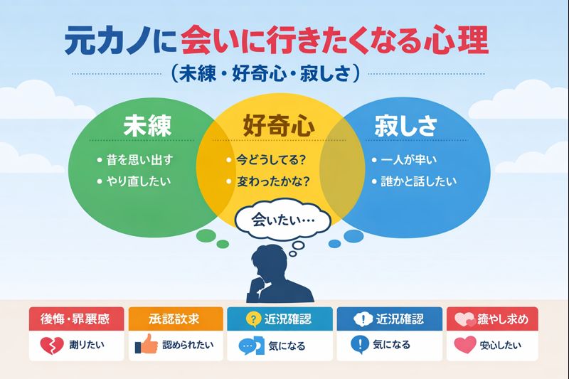 元カノに会いに行く、心理は未練だけでなく、寂しさや好奇心、罪悪感、承認欲求など複数の要因が重なって起きます。後悔を減らすには、会う目的を復縁か区切りかで言語化し、期待値を下げて最悪の展開も想定しておくことが大切です。復縁を狙うなら原因改善と距離感が鍵になります。まずは自分の本音を整理し、会った後に前向きになれる選択をしましょう。