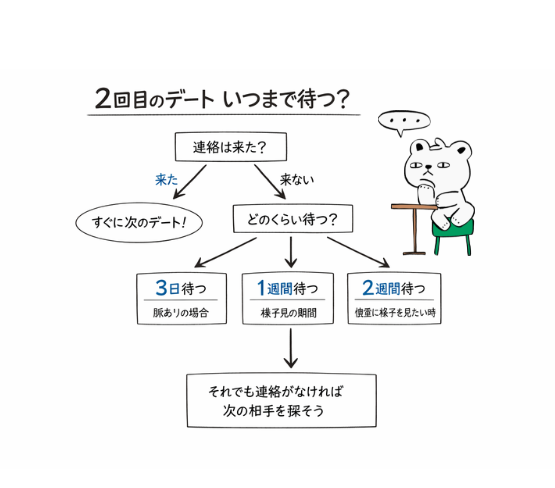 2回目のデートが決まらないと、頭の中は「脈なし?」「いつまで待つ?」でいっぱいになりますよね。実は待つべき期間には目安があり、相手のタイプや状況で最適解が変わります。この記事では、待つ日数の基準、脈あり・脈なしの見極め、自分から誘うタイミングとLINE例文、ケース別の対処まで整理。モヤモヤを減らし、次の一手が打てる状態にします。
