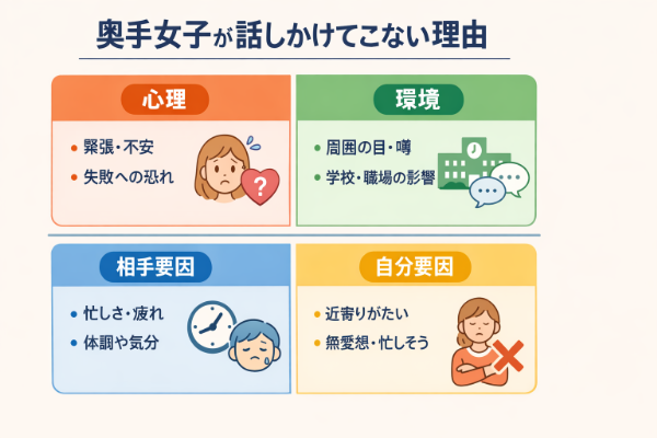奥手女子が話しかけてこないのは、あなたを避けたいからとは限りません。奥手な人は「失敗したくない」「変に思われたくない」が強く、行動が止まりやすい傾向があります。まずは心理と状況を分けて整理すると、打ち手が見えてきます。これらについては、知っておいた方がいいでしょう。