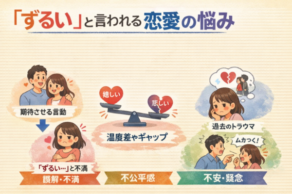 「ずるい」と言われた瞬間、胸がざわついて言葉が出なくなる人は少なくありません。自分は普通に接しているつもりなのに、なぜ責められるのか。そこには、期待・不安・不公平感が絡む恋愛特有の誤解が潜んでいます。この記事では、ずるいと言われた恋愛の悩みを整理し、相手がそう感じる心理、こじらせない返し方、誤解を生まない距離感、関係修復の手順までを具体的に解説します。