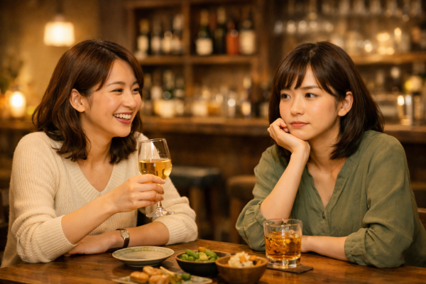 女性の酔い方は、誰と飲むかでも大きく変わります。安心できる相手の前では甘えたり饒舌になったりしやすく、気を遣う相手の前では無口になったり笑って合わせたりしやすくなります。つまり、酔い方は相手との関係性の写し鏡でもあります。好き嫌いだけでなく、その場でどれだけ安全だと感じているかが、言動の出方を左右すると考えると、見え方がぐっと整理しやすくなります。